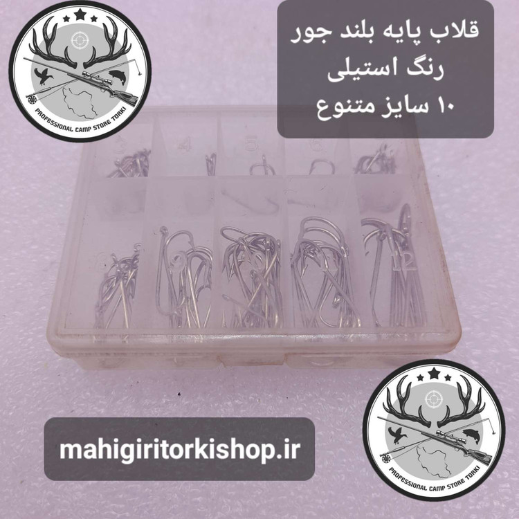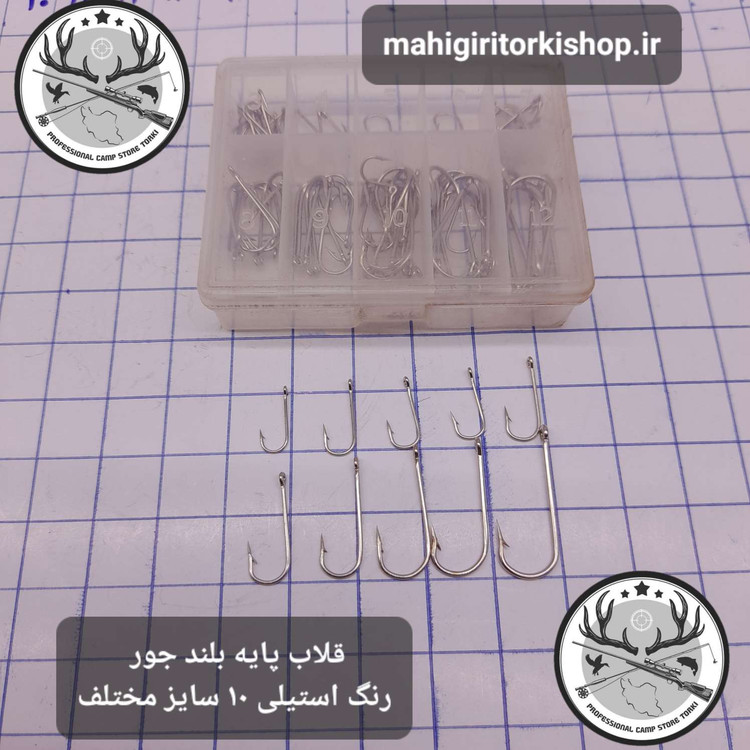 پک فوق شامل ۵۰ عدد قلاب در ده سایز متنوع میباشد و پایه بلند جنس فولادی و رنگ استیلی میباشند