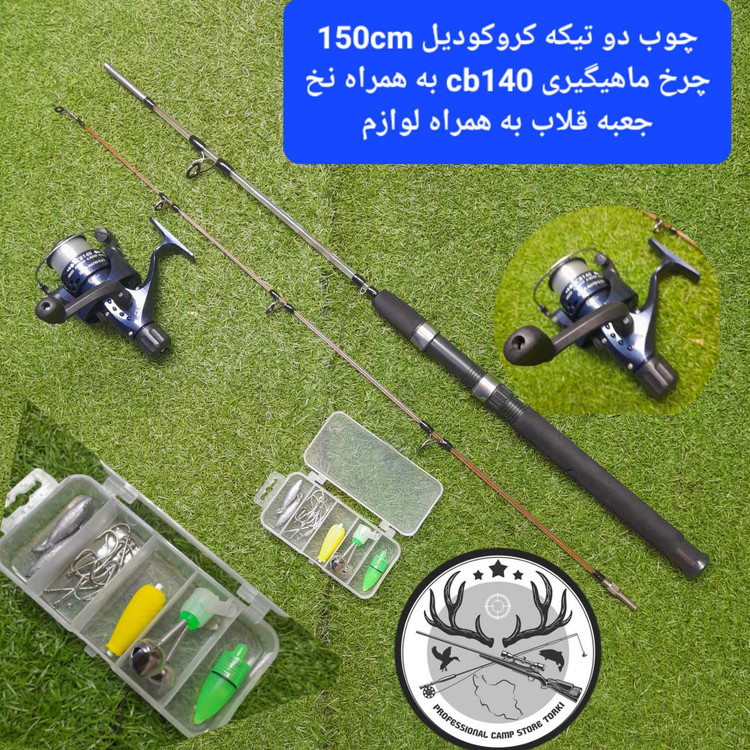 ست فوق یک لنسر ماهیگیری کامل شامل چرخ ماهیگیری cb140 یا همون چرخ کبری چوب دوتیکه توپر کروکودیل 150 سانتیمتری و جعبه قلاب ۵ خانه ماهیگیری شامل: