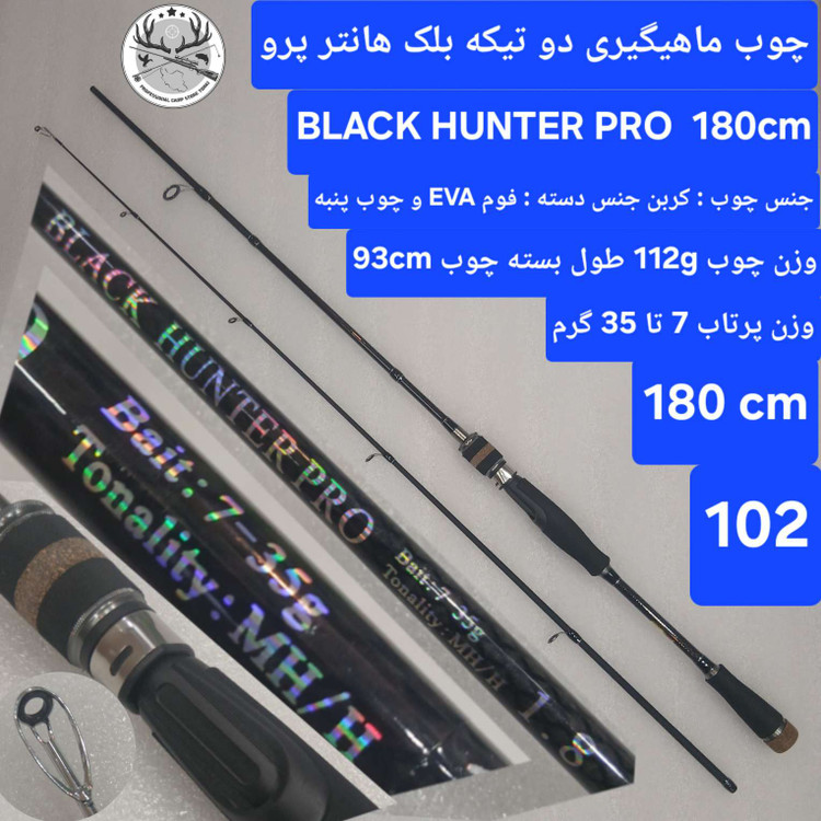 چوب ماهیگیری دو تیکه قزلی بلک هانتر از جنس کربن و بسیار سبک میباشد